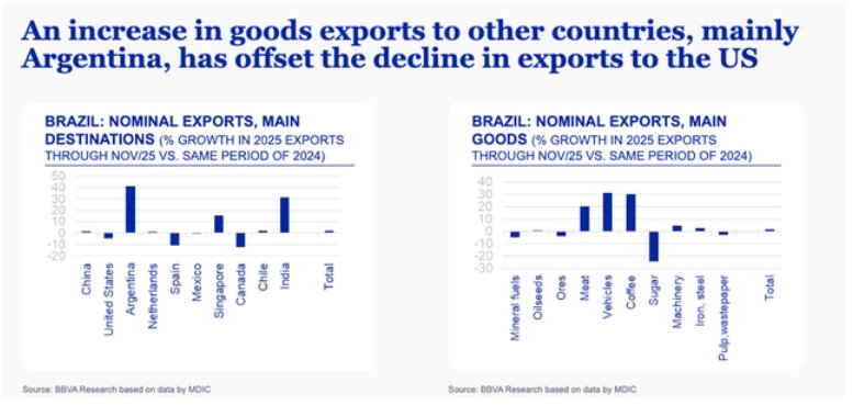 值得一提的是,巴西经济的一大亮点还在于其出口结构多元化,这有效降低了美国关税上调所带来的风险。通过将出口重心转向阿根廷等其他市场,巴西有力支撑了经济增长。尽管对美国等市场的出口额大幅下滑,今年前11个月巴西整体出口仍实现了约2%的增长。