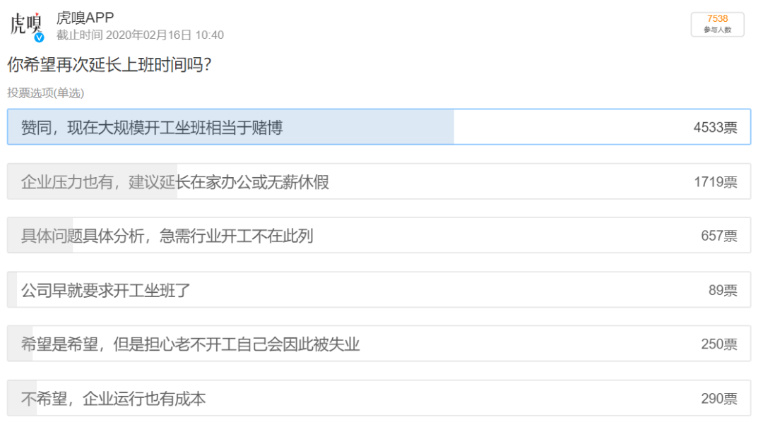 而根据虎嗅在新浪微博发起的投票,大约有60%的参与人员希望复工时间再度延迟。