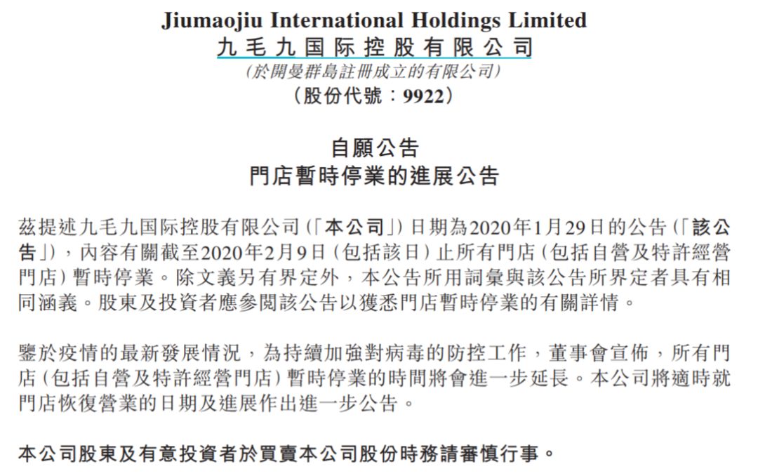 此外,港股餐饮企业九毛九也宣布所有门店暂时停业的时间进一步延长。