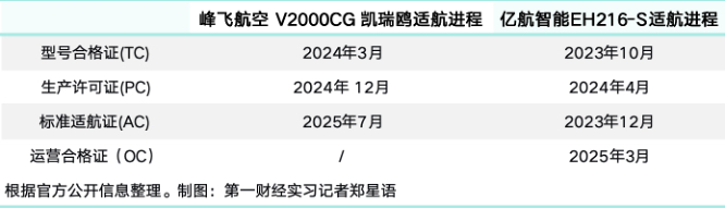 eVTOL想要跑通商业化,需要取得“适航三证”,即型号合格证(TC)、生产许可证(PC)和单机适航证(AC)。“适航三证”被视作民用飞行器正式商用的通行证。目前,亿航智能EH216-S已集齐TC、PC、AC和运营合格证(OC),峰飞航空V2000CG凯瑞鸥也获得了TC、PC和AC证件。