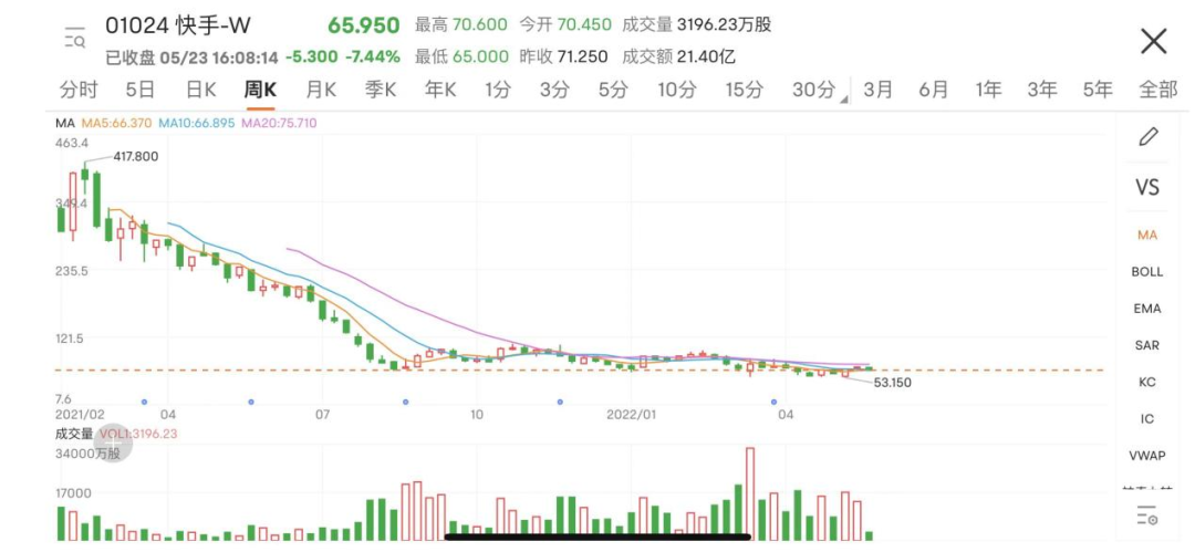 从股价表现来看,自快手上市后,其股价一路走低。截至5月23日,快手股价为65.95港元,总市值2816亿港元。相比上市后的417.8港元/股的最高点,目前快手股价已经跌逾八成,市值跌去1.5万亿港元。