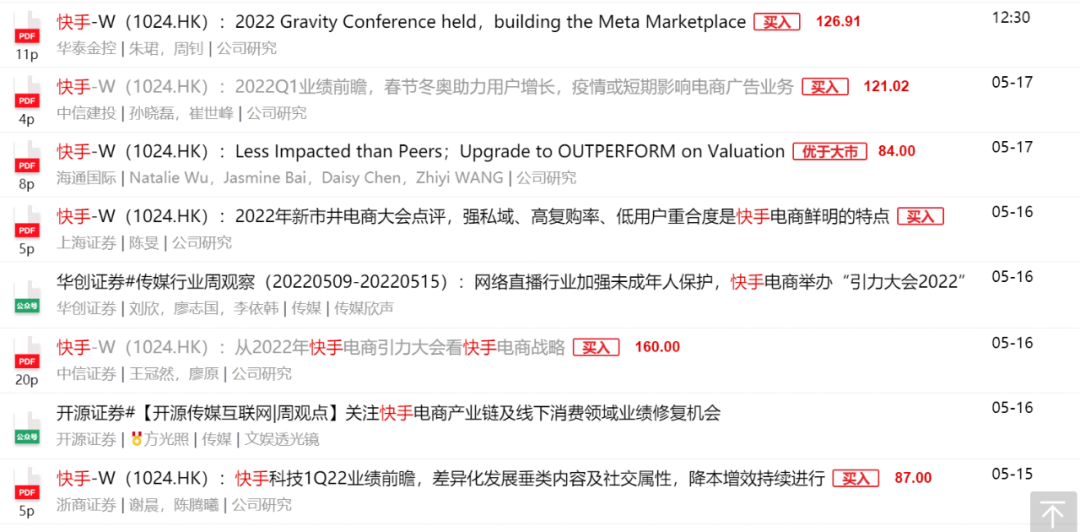 记者注意到,近期,包括中信证券、中信建投、海通国际在内的多家券商均在研报中对快手给出“买入”评级,其中中信证券给出的目标价高达160港元。相比5月23日65.95港元的收盘价,预期上涨空间到达143%。