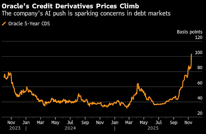 数据显示,自9月以来,随着对甲骨文公司债券信用保护的需求激增,相关信用衍生品的成本已翻了逾一倍。截至11月7日的六周内,与甲骨文相关的CDS交易量激增至约42亿美元,远超去年同期的2亿美元。