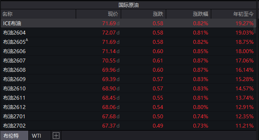受上述因素影响,国际原油期货市场在节日期间呈现震荡上行态势。截至2月24日,据wind统计数据,WTI原油盘中报66.87美元/桶,年初至今在上涨17.07%;ICE布油盘中报71.61美元/桶,年初至今累计上涨19.27%。两大基准油价的强势表现,反映出市场对供应端风险的重新定价。