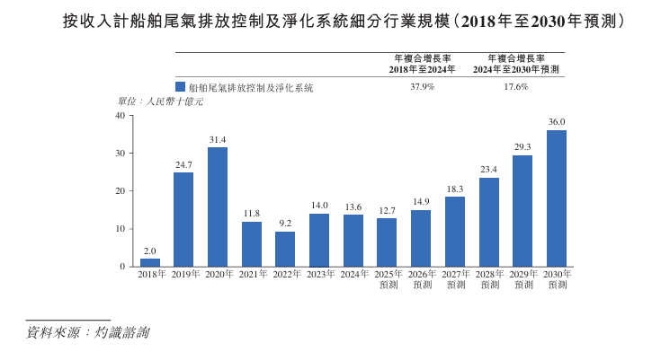 船舶尾气排放控制及净化系统细分行业规模按收入计从2018年的人民币20亿元增长到2020年的人民币314亿元,主要受国际海事组织2020年限硫令驱动,该限令促使船东安装脱硫系统以节省燃料成本。