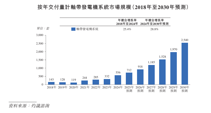 作为船舶能效增益系统细分行业的核心产品,船用轴带发电机系统的年交付量由 2018年的143套增至2024年的556套,预计到2030年将进一步攀升至2,540套。