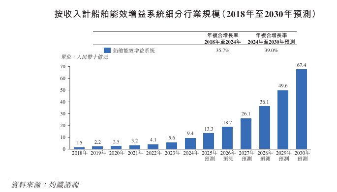 船舶能效增益系统细分行业规模按收入计已从2018年的人民币15亿元增长至 2024年的人民币94亿元,主要受船舶节油及优化技术的加速应用所驱动。