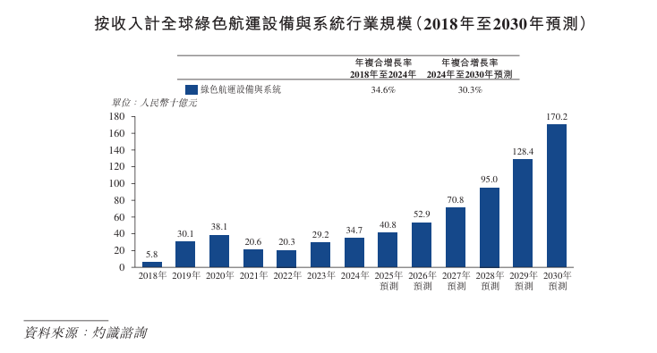展望未来,市场有望进一步扩张,预计到2030年市场规模将达到人民币1,702 亿元,从2024年至2030年的年复合增长率为30.3%。此强劲增长乃基于日趋严格的脱碳法规、加快的船队更新需求,以及船东对燃油效率、运营优化及长期资产表现的日益关注。