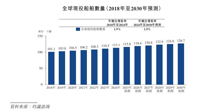 全球现役船舶数量已从2018年的101.1千艘增至2024年的113.1千艘,从2018年至2024年的年复合增长率为1.9%。展望未来,全球船队规模有望保持稳定增长态势,预计到2030年将达到126.7千艘,从2024年至2030年的年复合增长率为1.9%。