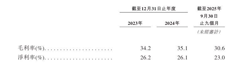 于2023年、2024年、2025年截至9月30日止九个月,公司毛利率分别为34.2%、35.1%、30.6%。