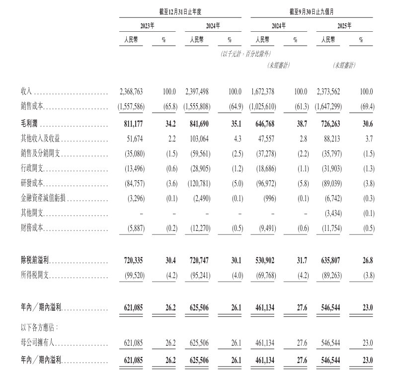 于2023年、2024年、2025年截至9月30日止九个月,公司录得年/期内溢利分别约为6.21亿元、6.26亿元、5.47亿元人民币。