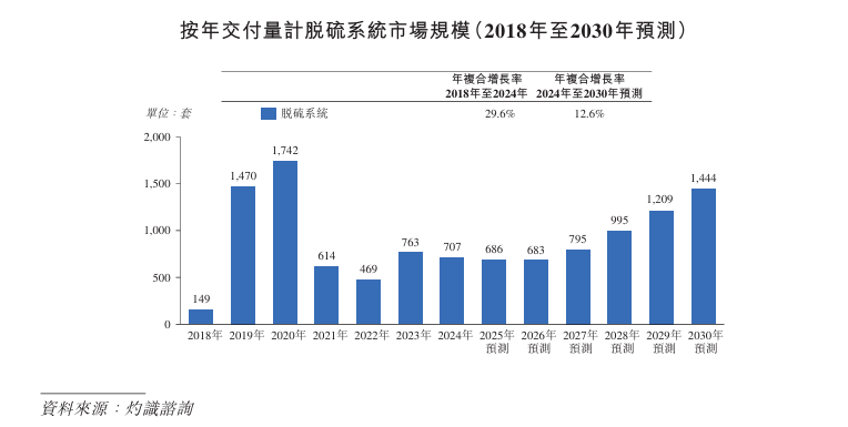 作为船舶尾气排放控制及净化系统细分行业中体量最大的部件,船用脱硫系统年交付量由2018年的149套增长至2024年的707套,预计到2030年将进一步攀升至1,444套。
