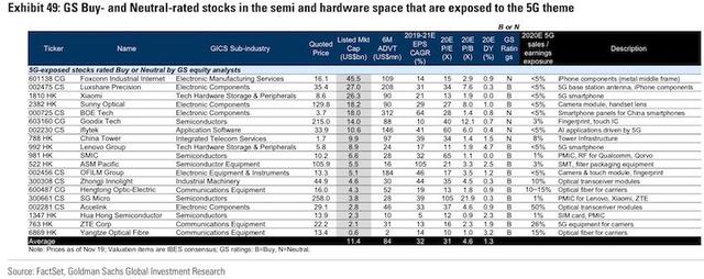 具体而言,高盛认为,当充分商业化后,5G将成为下一轮革命性、颠覆性的全球力量,其不仅将大大改善数据传输速率、降低延迟,同时核心技术也将催生新的商业模式(例如物联网、无人驾驶、AR/VR游戏,在线医疗服务等),这将重塑人们的生活方式。高盛的股票分析师预计,整体5G相关基建、网络的资本支出可能高达1530亿美元,这较4G全生命周期的1000亿美元要高出不少。中国已经成为5G技术方面的领跑者,拥有全球34%的5G专利。截至今年11月,4张5G牌照已经发放,共售出近78万台5G手机,50多个城市都已提供5G服务。参照3G/4G时代,在5G技术发展初期,电信设备市场、手机制造商、相关基建服务提供方可能更为受益。