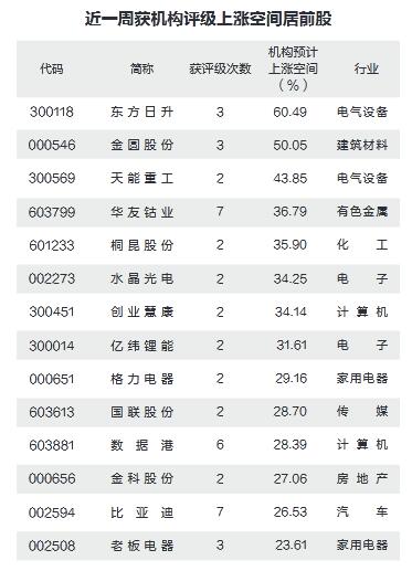 数据宝统计显示,近一周给出评级机构家数不少于2家的个股中,将机构公布的目标价与最新收盘价相比,东方日升、金圆股份、天能重工、华友钴业和桐昆股份等8股的机构平均预测上涨空间超30%。