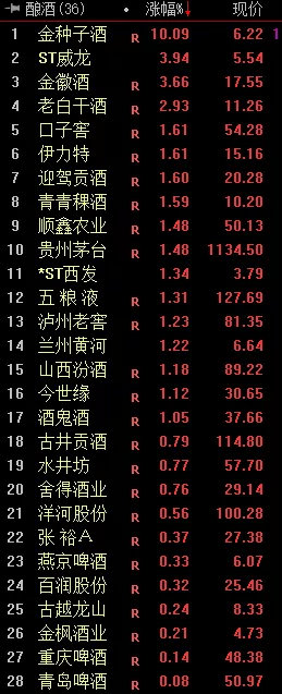 金种子酒开盘后迅速涨停、ST威龙、金徽酒、老白干酒涨幅超2%,贵州茅台、五粮液、酒鬼酒、泸州老窖等涨幅超1%。