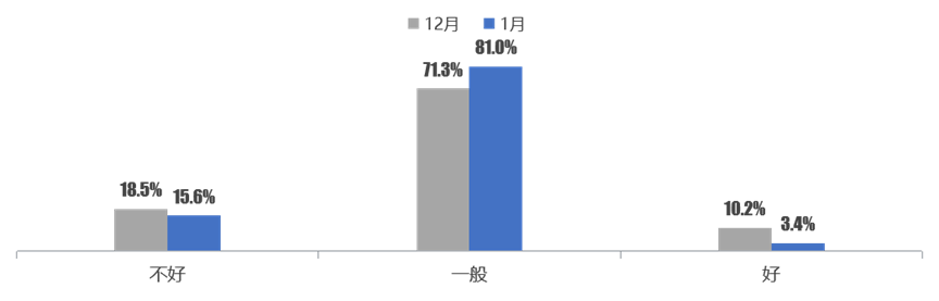 调查显示,1 月有 81.0% 的二手车经理人认为自身经营状况处于 “一般” 水平,该比例较上月有所上升,认为经营状况好的比例有所下降,显示二手车经销商整体经营压力增大。