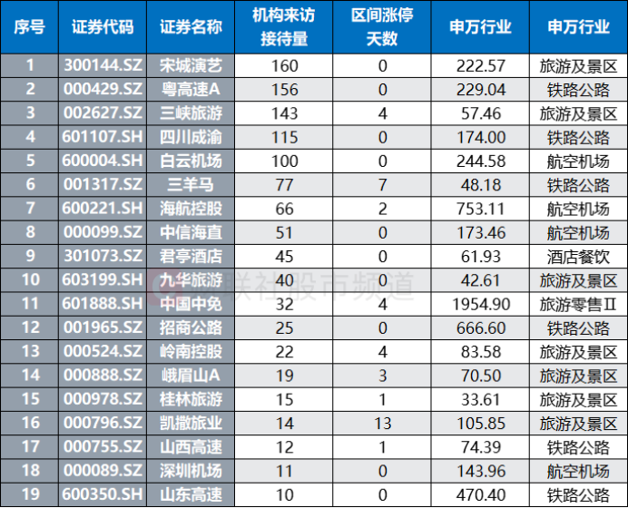 对于可关注标的方面,筛选旅游、酒店、出行链概念股,截至1月12日数据,宋城演艺、粤高速A、三峡旅游、四川成渝、白云机场5股近1年机构调研量在100次以上,三羊马、海航控股、中信海直、君亭酒店、九华旅游、中国中免、招商公路、岭南控股、峨眉山A等股近1年调研量也相对居前。