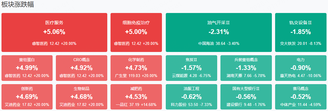 市场高开震荡,三大指数均涨超1%,科创50指数涨超3%。沪深两市成交额2.01万亿,较上一个交易日放量199亿。盘面上,市场热点快速轮动,全市场近4500只个股上涨。从板块来看,医药板块延续强势,十余只成分股涨停,睿智医药20cm涨停,津药药业4连板,润都股份、昂利康、海王生物涨停。算力硬件概念快速拉升,智立方20CM涨停,续创历史新高,瑞斯康达、铭普光磁、永鼎股份涨停。算力租赁概念反复活跃,奥瑞德11天6板。下跌方面,电力板块走弱,广西能源、惠天热电跌停。高铁轨交集体下挫,神州高铁炸板回落,通业科技、交大铁发大跌。