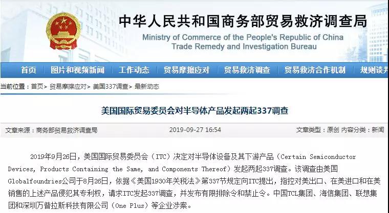 据商务部贸易救济调查局网站27日消息,9月26日,美国国际贸易委员会(ITC)决定对半导体设备及其下游产品发起两起337调查。该调查由美国Globalfoundries公司于8月26日,依据《美国1930年关税法》第337节规定向ITC提出,指控对美出口、在美进口和在美销售的上述产品侵犯其专利权,请求ITC发起337调查,并发布有限排除令和禁止令。中国TCL集团、海信集团、联想集团和深圳万普拉斯科技有限公司(One Plus)等企业涉案。