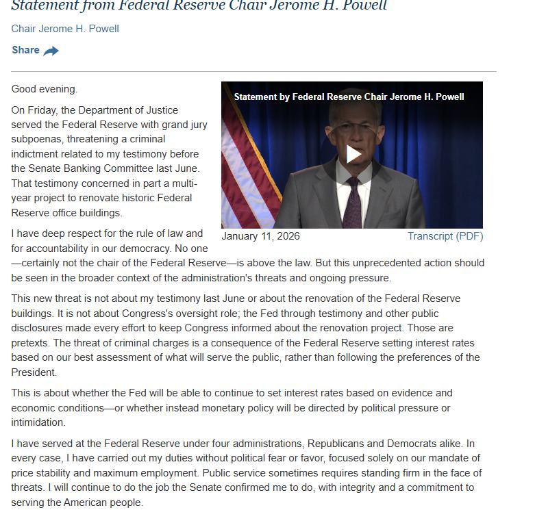 针对刑事指控一事,以下是美联储主席杰罗姆·鲍威尔(Jerome H. Powell)于当地时间1月11日发布于美联储官网的声明全文: