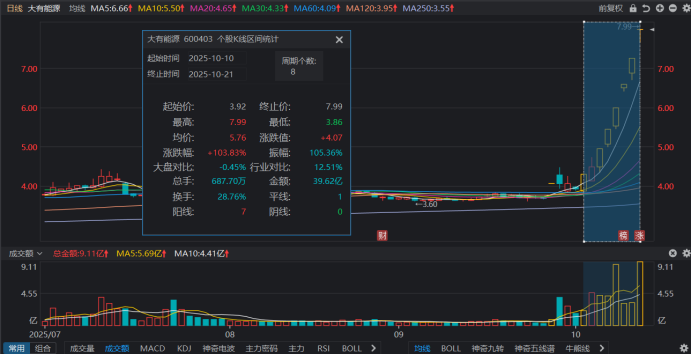 今日(10月21日),市场热股大有能源再获涨停,截至收盘,其成功晋级6连板,为目前最高连板标的。同时,大有能源近8个交易日累计上涨近103.8%,不计算新股情况,其成为首只本月翻倍股。