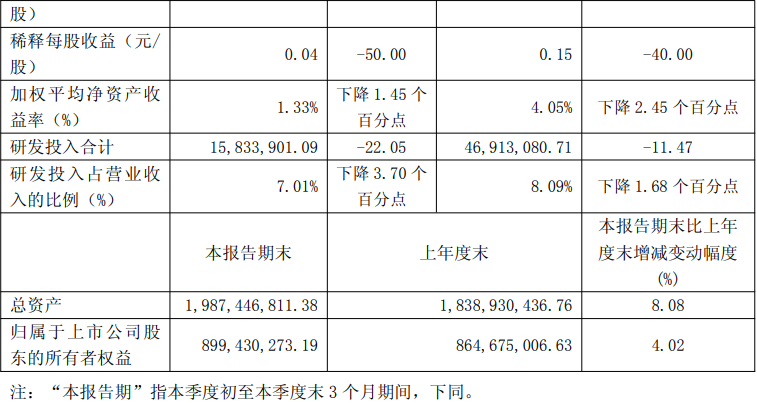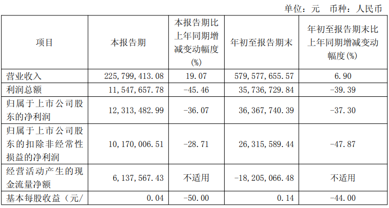 第三季度实现营收2.26亿元,同比增长19.07%;归属于上市公司股东的净利润1231.35万元,同比下降36.07%;基本每股收益0.04元。