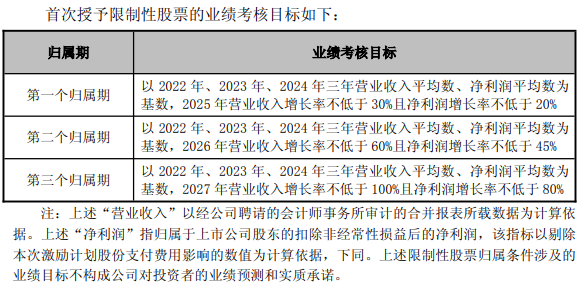 公司拟向激励对象首次授予限制性股票604.89万股。三个归属期的考核目标分别为以2022年、2023年、2024年三年营业收入平均数、净利润平均数为基数,2025年营业收入增长率不低于30%且净利润增长率不低于20%;2026年营业收入增长率不低于60%且净利润增长率不低于45%;2027年营业收入增长率不低于100%且净利润增长率不低于80%。