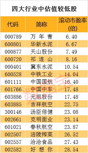 从最新估值水平来看,4股滚动市盈率尚不足10倍,分别是万年青(000789)、华新水泥(600801)、天山股份(000877)、祁连山,这4股均为水泥制造公司,万年青滚动市盈率最低,仅6.4倍。另外,水泥股冀东水泥滚动市盈率10.54倍,中铁工业(600528)滚动市盈率14.04倍,滚动市盈率较低的还有中国国航(601111)、中国中车(601766)、元祖股份(603886)、吉祥航空(603885)、汤臣倍健(300146)等。