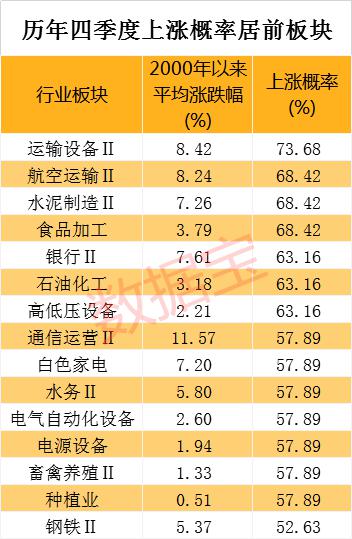 证券时报.数据宝统计了2000年以来申万二级行业的历史表现发现,四季度上涨概率最高的是运输设备板块,近十九年来该板块指数上涨概率达到73.68%,平均涨幅为8.42%。航空运输、水泥制造、食品加工板块上涨概率均为68.42%,并列第二位。除上述四大板块外,上涨概率在60%以上的还有银行、石油化工、高低压设备板块。