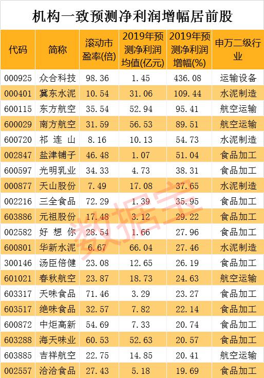 数据宝在上述运输设备、航空运输、水泥制造、食品加工四大板块中,筛选出机构一致看好的上市公司。数据显示,获5家以上机构一致预测2019年度净利润增幅超过10%的个股,共计30只。从净利润预测增幅来看,众合科技(000925)、冀东水泥(000401)、东方航空(600115)、南方航空(600029)、祁连山(600720)、盐津铺子(002847)等获机构一致预测净利润增幅超过50%。