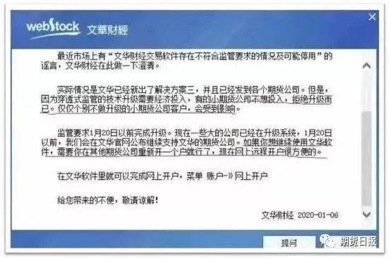 1月3日,广州期货公告称,经排查,文华财经交易软件暂不符合监管的要求,我司将继续跟进了解文华财经交易软件整改情况,若其在2020年1月21日前仍无法满足监管要求,将面临停用的风险。