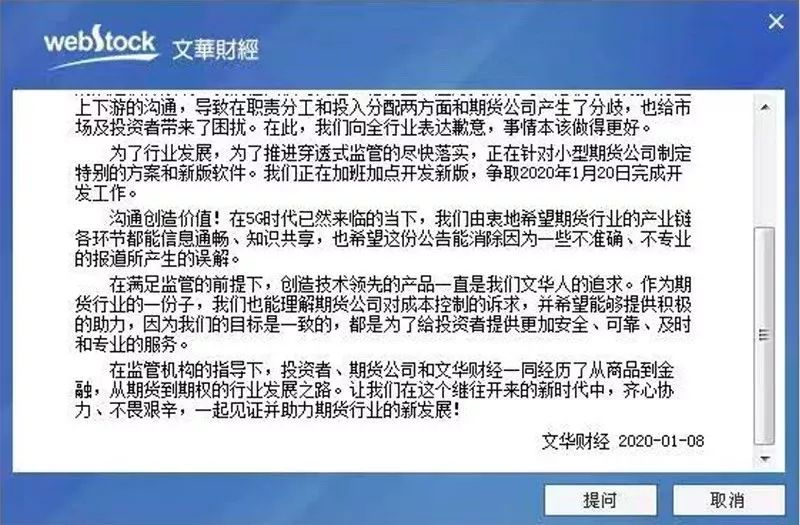 8日,文华财经针对此事再度作出回应,语气显然缓和很多。不过,1月10日,还是迎来了期货公司的集体暂停使用。