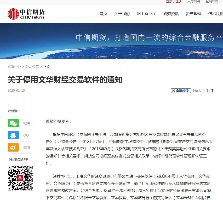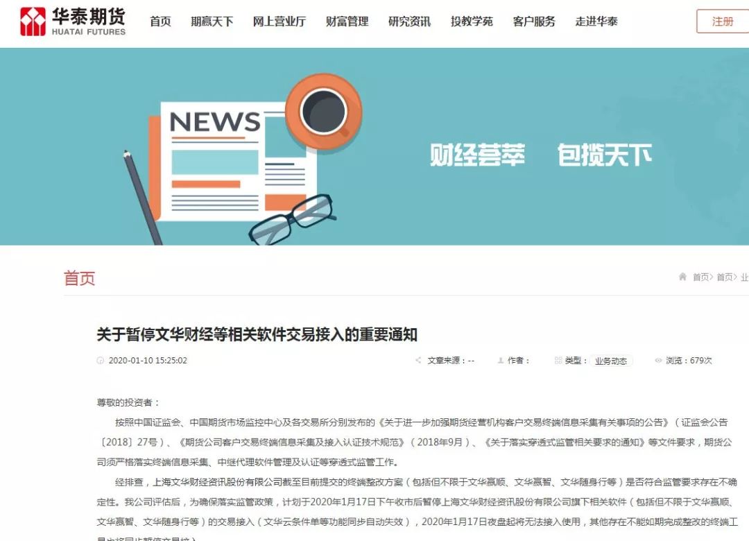 2020年1月10日,中信期货、永安期货、华泰期货、海通期货、南华期货、广发期货、招商期货等一批国内头部期货公司纷纷发布公告,宣布将于1月17日或1月20日,暂停文华财经的交易接入,近乎宣布文华财经“死刑”。