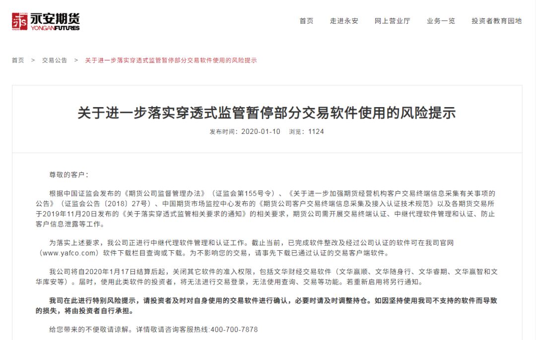 以永安期货的公告为例,根据证监会发布的《期货公司监督管理办法》(证监会第155号令)、《关于进一步加强期货经营机构客户交易终端信息采集有关事项的公告》(证监会公告〔2018〕27号)、中国期货市场监控中心发布的《期货公司客户交易终端信息采集及接入认证技术规范》以及各期货交易所于2019年11月20日发布的《关于落实穿透式监管相关要求的通知》的相关要求,期货公司需开展交易终端认证、中继代理软件管理和认证、防止客户信息泄露等工作。