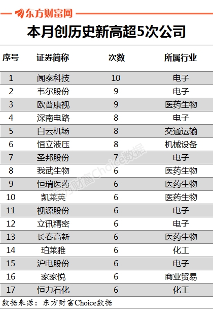 更值得注意的是,这67家公司不是说创历史新高就完了,而是不少公司都在频繁的创出历史新高,其中的56家公司(占比83.6%)在9月至少2次创出历史新高,其中17家公司更是超过5次。