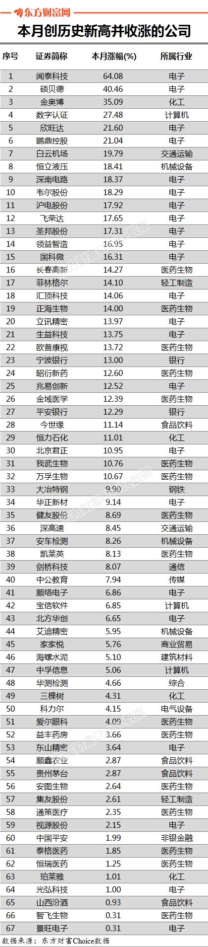 数据显示,截至9月27日,本月共67家公司创出历史新高(不含次新股以及9月股价下跌的公司)。