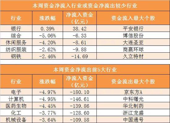 28个申万一级行业中,本周仅银行1个行业实现资金净流入,电子、计算机、医药生物、化工等行业净流出规模居前,其中电子行业净流出180.10亿元居首。