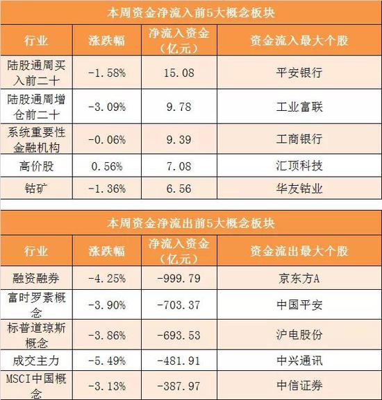 概念板块方面,本周陆股通周买入前二十、陆股通周增仓前二十、系统重要性金融机构、高价股等概念板块资金呈现净流入,其中陆股通周买入前二十概念净流入15.08亿元居首。