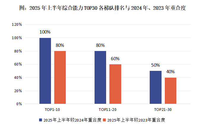再次,整体保持“头部稳定、腰部发力、尾部洗牌”的格局。经过一年多洗牌与调整,目前代建赛道整体格局保持相对稳定。但各梯队之间差异显著、竞争激烈。从2025年上半年综合能力TOP30与2023年、2024年相比来看,TOP10与2024年相一致,与2023年重合度为80%,由此可见,头部企业格局相对稳定。变化最大的为TOP21-30的企业,2025年上半年与2024年重合度仅为50%,与2023年甚至只有40%,大幅变动也印证了当前竞争激烈下,代建企业在不断的洗牌和淘汰。实际上,部分发展较早的浙系房企及依靠纾困代建参与市场的房地产企业,在这一轮扩张中也已销声匿迹。