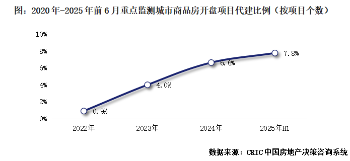 根据CRIC数据统计,重点监测的38个重点城市代建渗透率由2022年的0.89%跃升至2025年上半年的7.76%,创下历史新高。然而,2025年上半年渗透率较2024年仅提升近1.1个百分点,增速明显放缓。