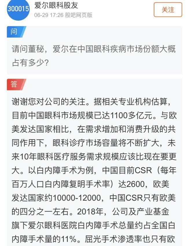 近日,有投资者在互动平台向爱尔眼科提问:公司在国内眼科疾病的市场份额有多大?公司答复:以白内障手术为例,中国目前CSR(每年百万人口白内障复明手术率)达2600,欧美发达国家约为10000-12000,中国CSR只有欧美的四分之一左右。2018年,公司及产业基金旗下爱尔眼科医院白内障手术总量约占全国白内障手术量的11%。