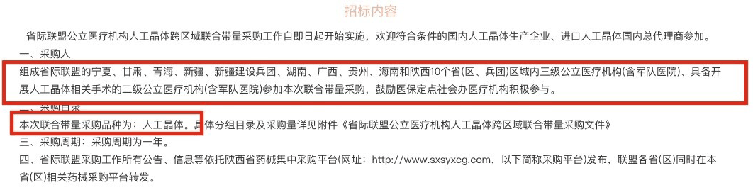 此次陕西省发布的《采购文件》显示,本次省际联盟成员包括宁夏、甘肃、青海、新疆、新疆建设兵团、湖南、广西、贵州、海南和陕西。联合带量采购品种为人工晶体,采购周期为1年。