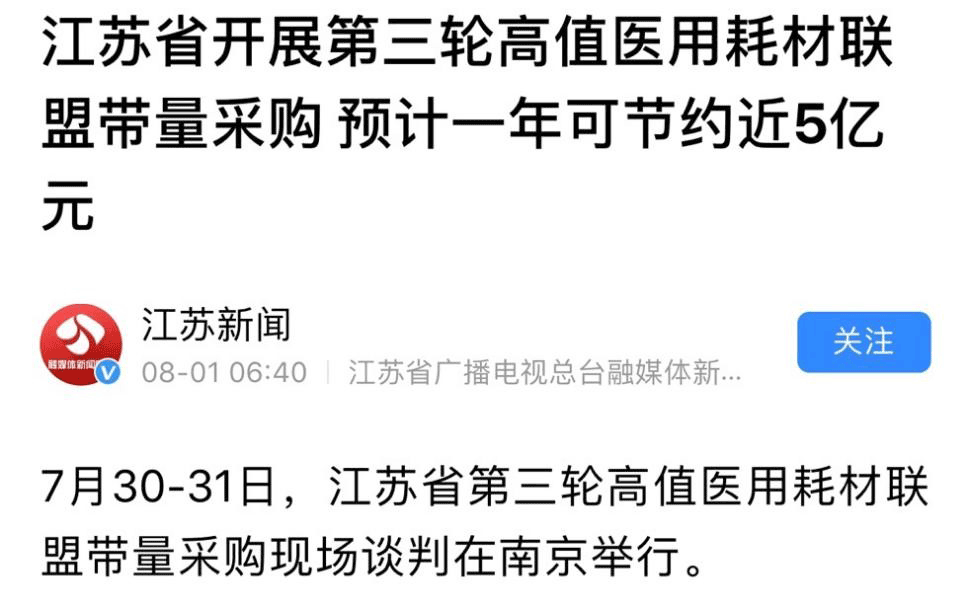 7月30日至31日,江苏省已开始第三轮高值医用耗材联盟带量采购。