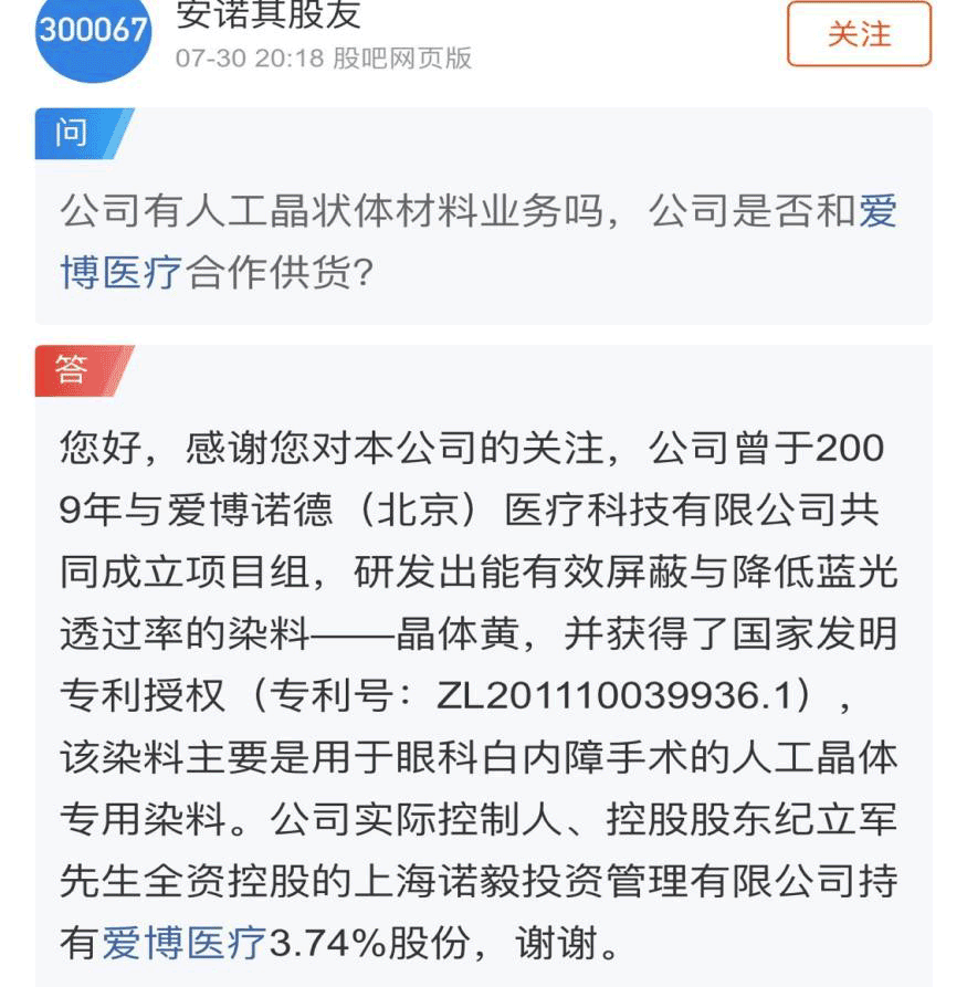 7月30日,有投资者在互动平台向安诺其提问,公司有人工晶状体材料业务吗,是否和爱博医疗合作供货?安诺其答复,公司曾于2009年与爱博医疗共同成立项目组,研发出能有效屏蔽与降低蓝光透过率的染料——晶体黄,并获得了国家发明专利授权,该染料主要是用于眼科白内障手术的人工晶体专用染料。公司实际控制人、控股股东纪立军全资控股的上海诺毅投资管理有限公司持有爱博医疗3.74%股份。