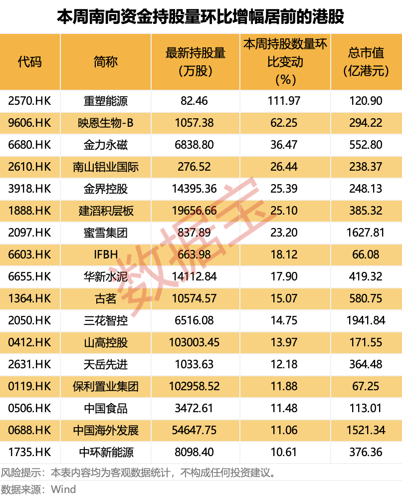 据数据宝统计,从持股量变化来看,本周17股的南向资金持股量环比增长超10%,重塑能源居首,环比增长111.97%;映恩生物-B、金力永磁持股量环比增长30%以上,均获得南向资金大幅度加仓。