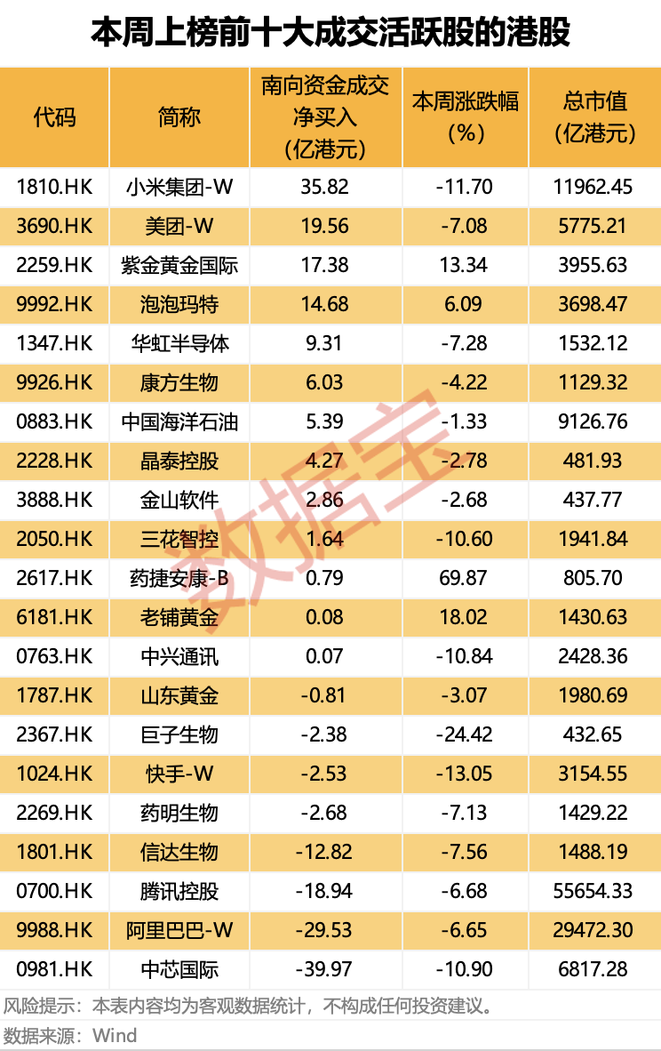 从本周每日前十大活跃个股名单来看,共有21股上榜,阿里巴巴-W本周港股通成交总额最高,达到855.29亿港元;中芯国际、小米集团-W、腾讯控股本周港股通买卖总额均超过300亿港元。