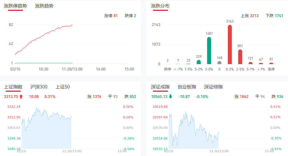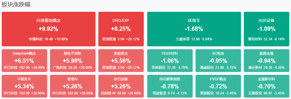 市场早盘震荡分化,三大指数涨跌不一。沪深两市半日成交额1.11万亿,较上个交易日缩量367亿。盘面上市场热点围绕AI方向展开,个股涨多跌少,全市场超3300只个股上涨。从板块来看,DeepSeek、算力方向维持强势,美格智能等30余股涨停。AI应用方向集体走强,医疗信息化、财税、数据要素等多个方向大涨,思创医惠等涨停。脑机接口概念股盘中异动,创新医疗涨停。下跌方面,光伏概念股展开调整,上能电气跌超5%。