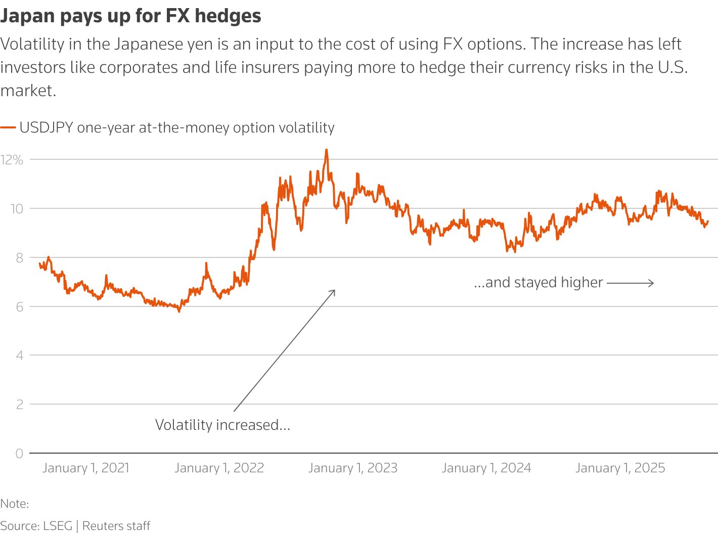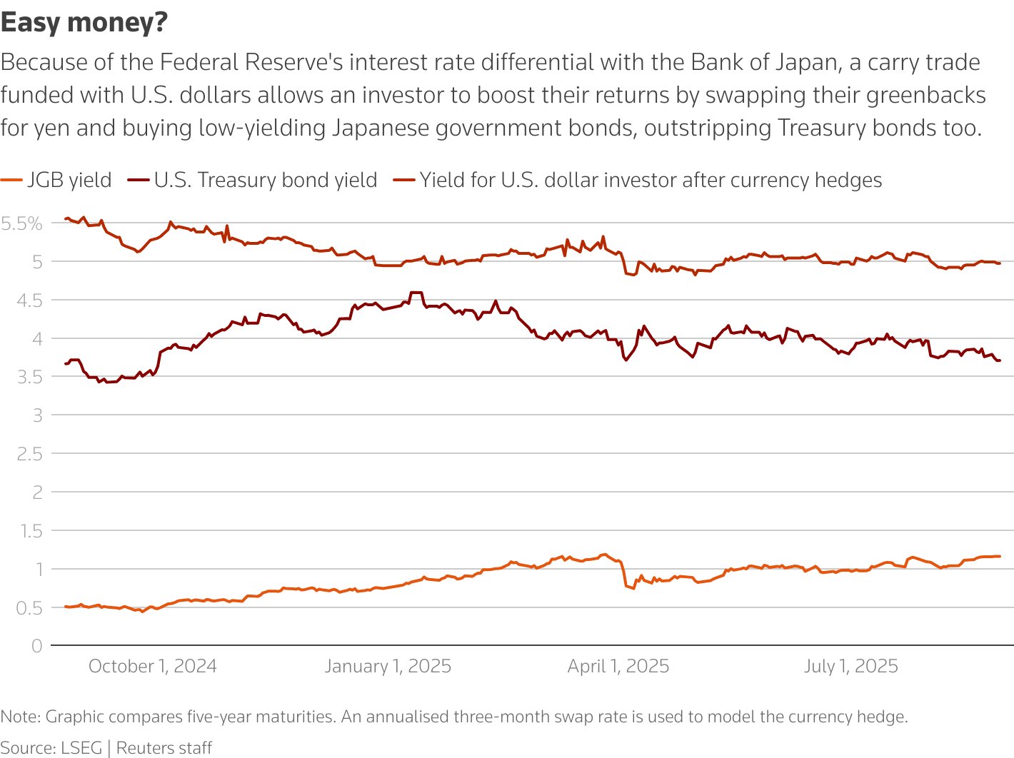 外国买家在日本国债中能够获得显著超额收益。五年期美债的收益率仅为3.86%,而相同期限的日本国债经美元互换后能提供5%的收益。这种债市“魔法”之所以可能,是因为美联储与日本央行之间巨大的利率差异。