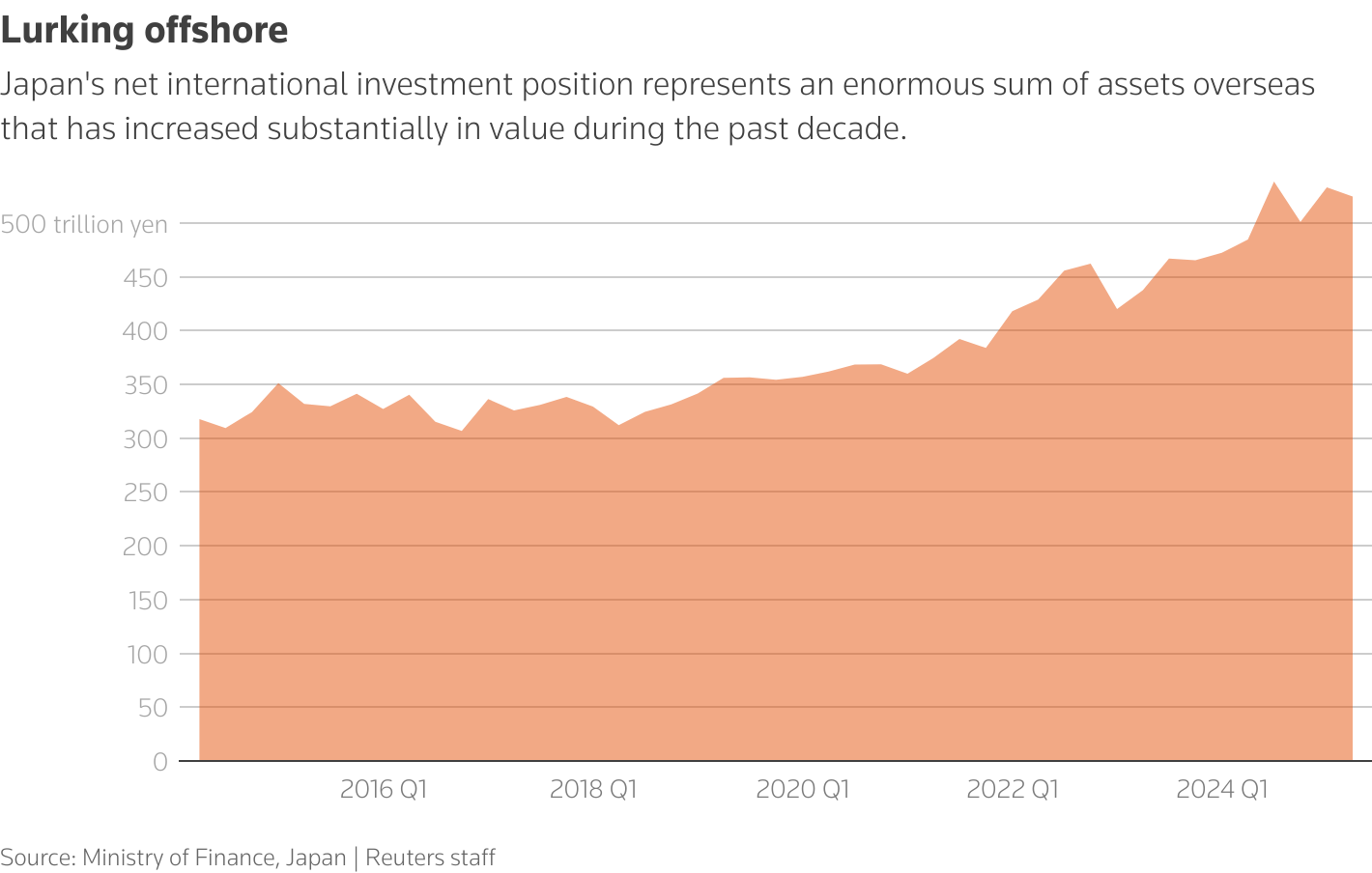 今年早些时候,日本失去了“全球最大债权国”的头衔,被德国取代。然而,日本仍有相当数量的金融资产在海外,这些资产在必要时可能被出售并带回国内。