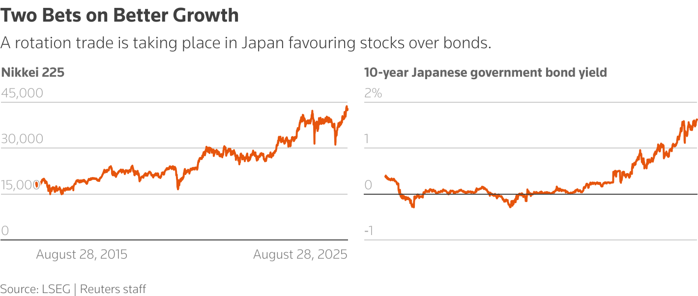 押注经济增长更强劲的投资者正在撤出固定收益资产,转而投入股市。日经225指数和东证指数今年已创下历史新高。